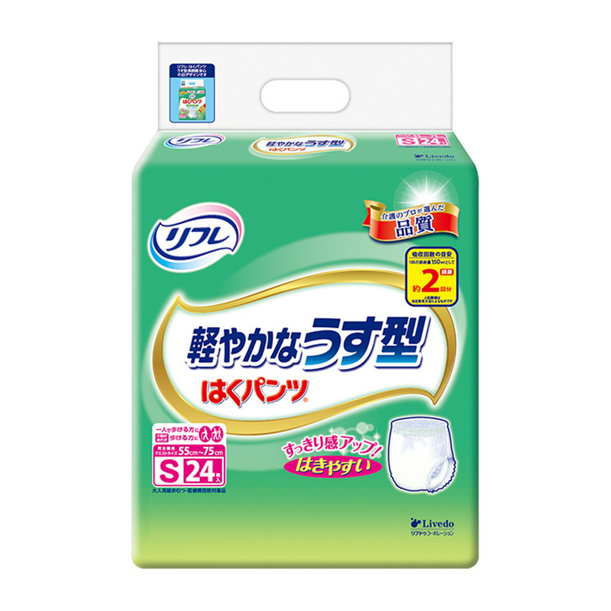 ■商品説明・介助があれば歩ける、立てる、座れるという方のための介護用パンツ(おむつ)です。 ・ベビー用より大きく大人用より小さいサイズ。 ・薄型長時間安心パンツ。 ・ウエスト部分が軽い力でぐーんと伸びて上げ下げカンタン。 ・お腹まわりはしめつけないのにやさしく体にフィットし、ズレを防止。 ・ふんわり柔軟仕上げでお肌にやさしい肌ざわり。 ・うす型吸収体と股下すっきりカットでゴワゴワせず動きやすい。 ・安心のおしっこ約4回分吸収。 (1回の排尿量150mLとして) ・横モレ防止ギャザーが足まわりにフィットし、尿をせき止めます。 ・全面通気性シート。 パワー消臭吸収体。 ・医療費控除対象品。
